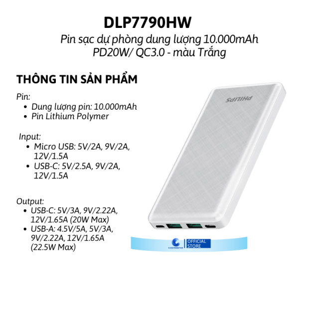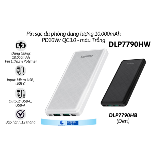 Thương hiệu: PhilipsNơi sản xuất: Trung Quốc.Thời gian bảo hành: Không có thông tin rõ ràng. Vui lòng liên hệ nhà phân phối để biết thêm chi tiết.Thông tin sản phẩmPin sạc dự phòng Philips DLP7790 là một phụ kiện di động mạnh mẽ, lý tưởng cho những người thường xuyên di chuyển. Với dung lượng 10.000mAh và công nghệ sạc nhanh tiên tiến, sản phẩm này giúp bạn duy trì kết nối liên tục suốt cả ngày.Thiết kế: Kiểu dáng nhỏ gọn, mỏng nhẹ với lớp vỏ màu đen nhám (hoặc có phiên bản màu trắng), dễ dàng cầm nắm và mang theo.Chất liệu: Được chế tác từ chất liệu cao cấp như PC + ABS, đảm bảo độ bền và an toàn khi sử dụng.Dung lượng: 10.000mAh, đủ để sạc đầy nhiều lần cho điện thoại thông minh hoặc máy tính bảng.Loại pin: Pin Lithium Polymer an toàn, chống cháy nổ và có tuổi thọ cao.Tính năng Nổi bậtSạc nhanh đa năng: Hỗ trợ nhiều công nghệ sạc nhanh phổ biến như Power Delivery (PD) 20W và Quick Charge (QC) 3.0, giúp sạc đầy thiết bị nhanh chóng.Đầu ra mạnh mẽ: Cổng USB-A có công suất tối đa 22.5W và cổng USB-C có công suất tối đa 20W, cho phép sạc nhiều thiết bị với tốc độ cao.Sạc cùng lúc nhiều thiết bị: Với hai cổng đầu ra (USB-A và USB-C), bạn có thể sạc hai thiết bị cùng lúc một cách tiện lợi.Tính năng an toàn: Tích hợp các tính năng bảo vệ chống quá dòng, quá áp và ngắn mạch, đảm bảo an toàn tối đa cho cả pin sạc và thiết bị của bạn.Công dụngSử dụng hàng ngày: Lý tưởng khi đi học, đi làm, hoặc khi bạn cần sạc điện thoại gấp mà không có ổ cắm.Du lịch và dã ngoại: Là người bạn đồng hành không thể thiếu trong các chuyến đi, đảm bảo các thiết bị điện tử của bạn luôn có đủ năng lượng.Sạc đa thiết bị: Phù hợp để sạc điện thoại, máy tính bảng, tai nghe không dây, và các thiết bị di động khác.Thông số Kỹ thuậtThương hiệu: PhilipsMã sản phẩm: DLP7790 (DLP7790HB cho bản màu đen)Loại pin: Li hium PolymerDung lượng: 10.000mAh / 3.7V / 37WhĐầu vào (Input):Micro USB: 5V/2A, 9V/2A, 12V/1.5AUSB-C: 5V/2.5A, 9V/2A, 12V/1.5AĐầu ra (Output):USB-A: 4.5V/5A, 5V/3A, 9V/2.22A, 12V/1.65A (tối đa 22.5W)USB-C: 5V/3A, 9V/2.22A, 12V/1.65A (tối đa 20W)Màu sắc: Đen (có cả phiên bản màu trắng)Trọng lượng: Khoảng 0.227 kgKích thước: Khoảng 14.75 x 6.84 x 1.62 cmLưu ý: Sản phẩm được giao ngẫu nhiên, không hỗ trợ chọn màu hoặc phân loại cụ thể